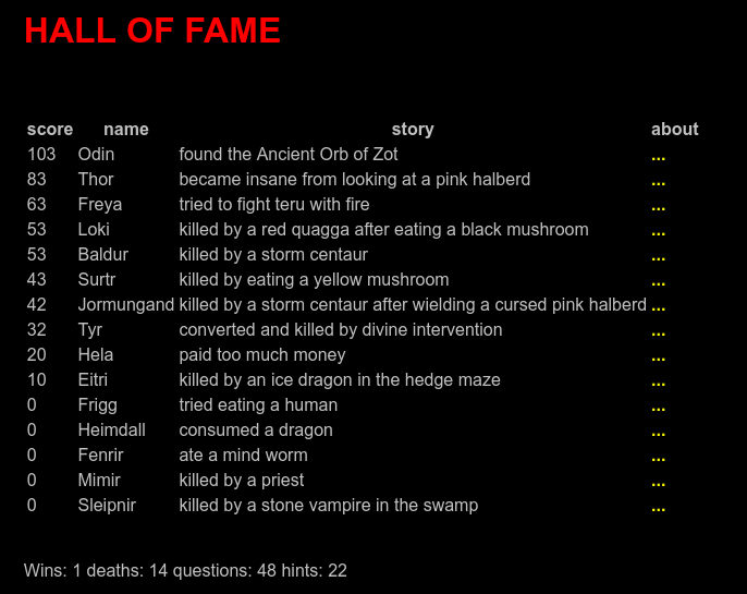 This is an entry to roguetemple's Fortnight. This is not a roguelike, it lacks what made Rogue different from text adventures. It is more of a pastiche of the rules of the jam, according to which NetHack and other roguelikes I started which are not "traditional roguelikes". (See the in-game "rant" for more.)